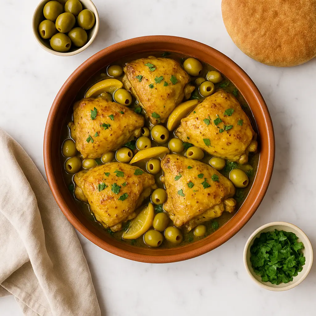 Le tajine de poulet aux citrons confits et olives est un grand classique de la cuisine marocaine. Savoureux, parfumé et simple à préparer, il se cuisine doucement pour obtenir une viande fondante et une sauce riche en goût. Voici une version facile à réaliser à la maison, même sans plat à tajine (une cocotte fait très bien l’affaire).
